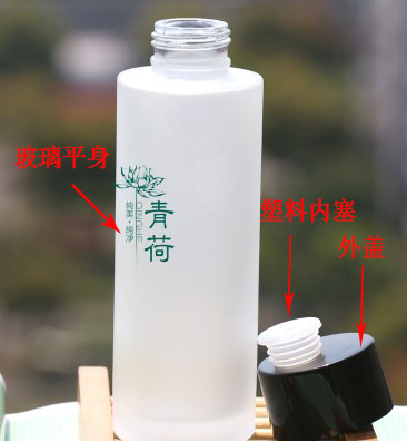 大于100ml以上的爽膚水系列,通常使用玻璃瓶身+小內蓋+外蓋,這種包裝,也可以配有泵頭的那種,見圖三