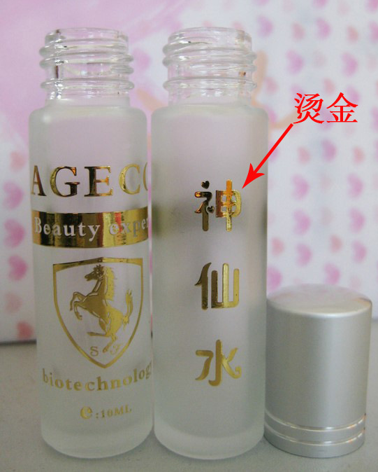 絲印:玻璃瓶絲印通常有兩種,一種是高溫油墨絲印,其特點是不易脫色,色澤較沉啞,紫色調色較難出效果,另一種是低溫油墨絲印,色澤較艷,對油墨的要求較高,否則易脫落,且在瓶子消毒方面要注意。燙金燙銀0.4/款。